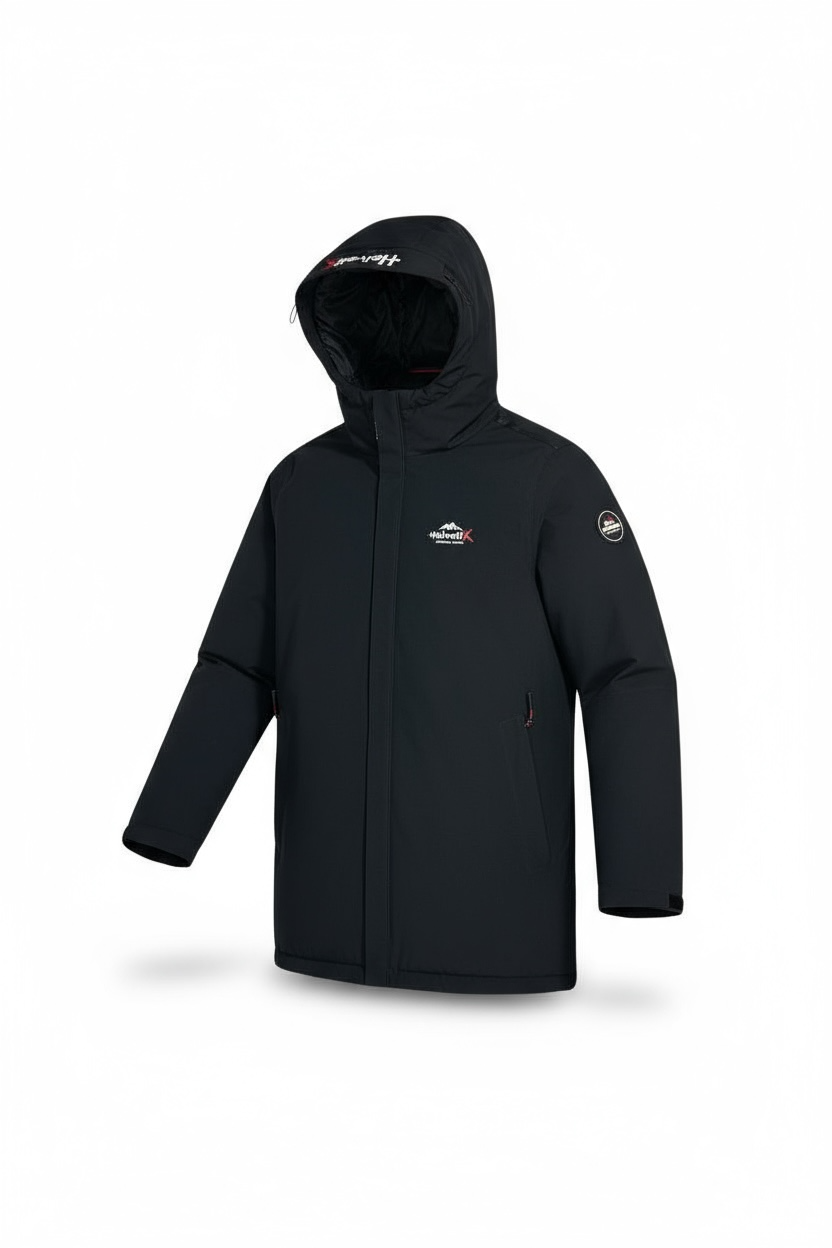 doudoune helvetica, helvetik rimk, helvetica mountain pioneers, edition speciale rimk, collaboration helvetica x rimk, doudoune homme noire, hiver 2025, cagoule signée, manteau chaud, streetwear français, limited edition.