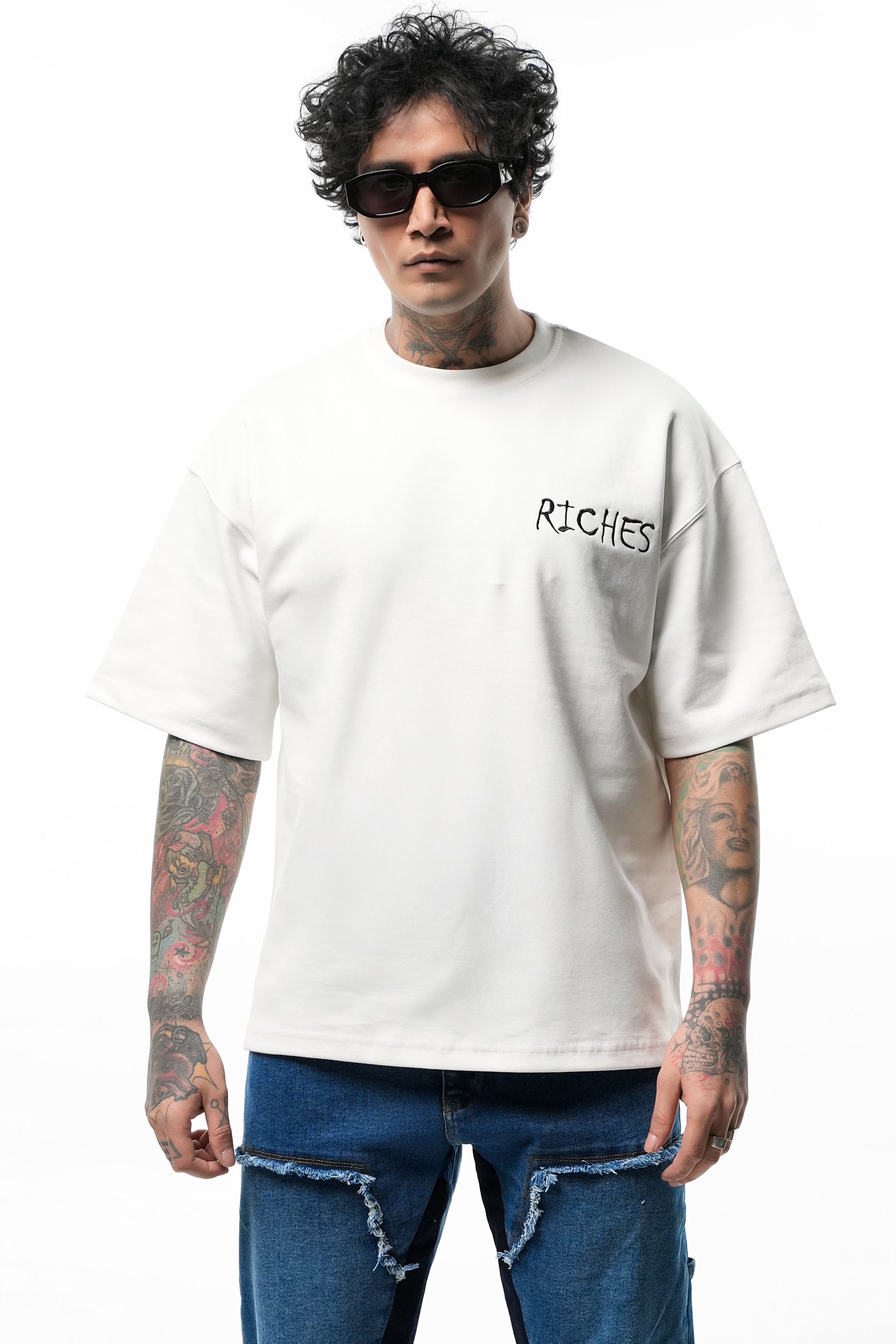 Mots-clés SEO : t-shirt Monopoly, Riches Paris, streetwear homme, t-shirt oversize brodé, mode urbaine luxe, fashion culture, look street Monopoly, t-shirt original Riches Paris.