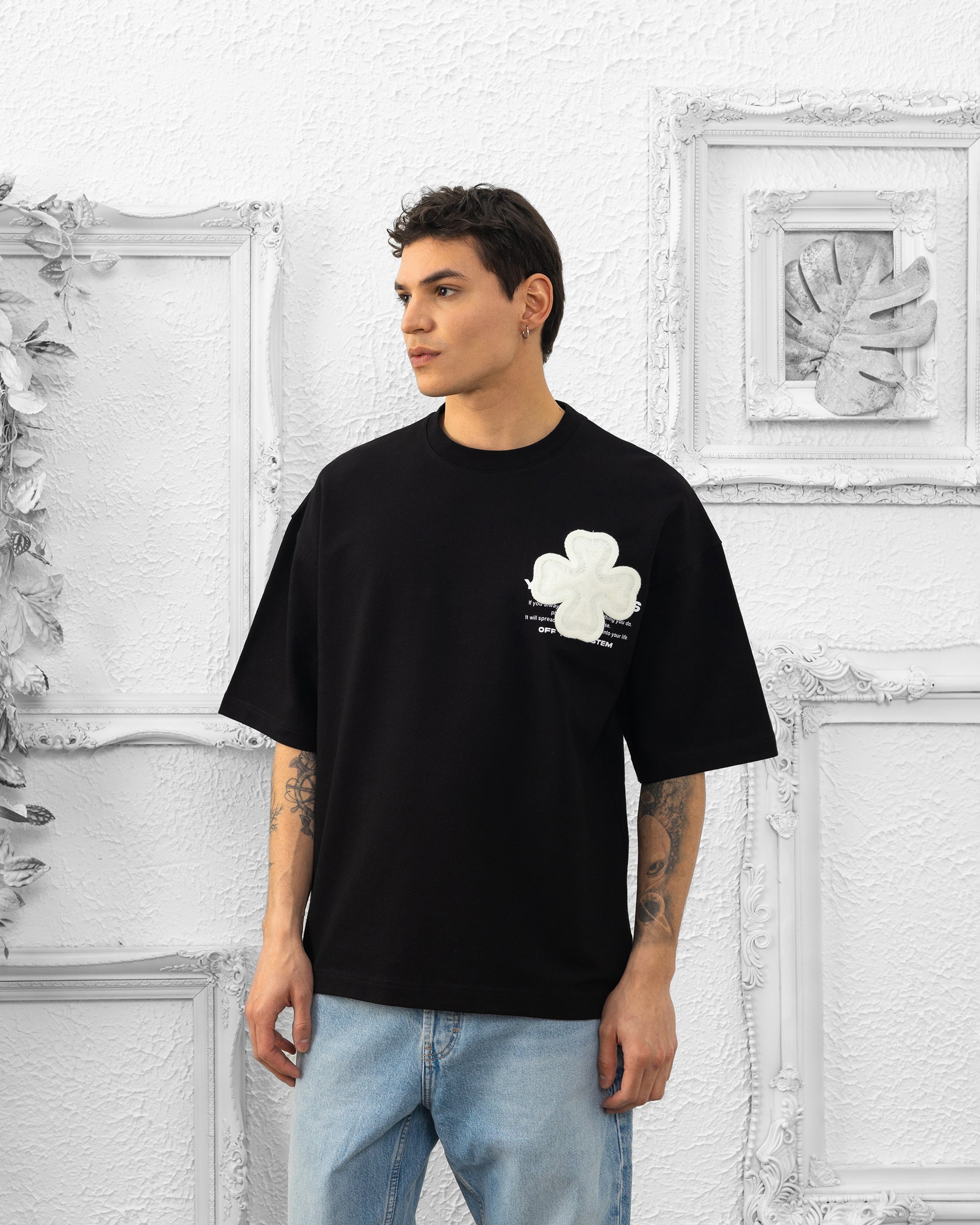 t-shirt, trèfle, oversize, noir, broderie, streetwear, unisexe, coton, coupe large, brodé, design original, mode urbaine, minimalisme, homme, femme