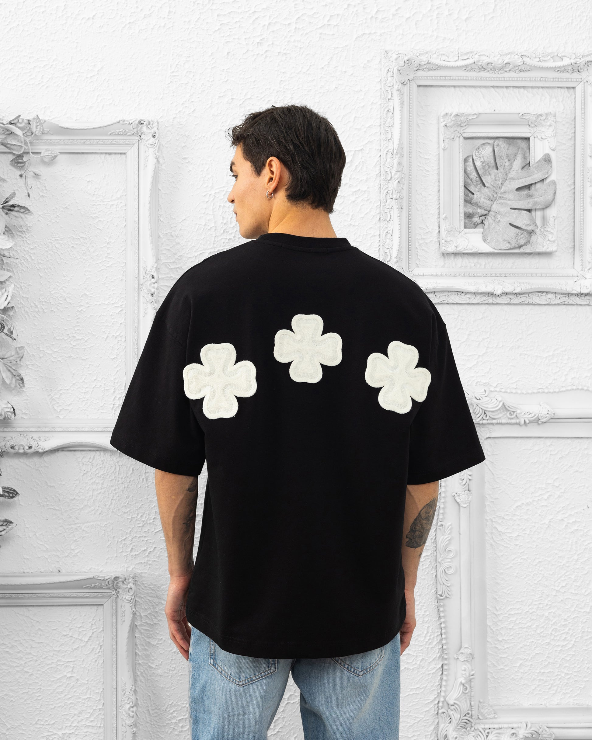 Mots-clés SEO : t-shirt noir oversize, t-shirt trèfle brodé, t-shirt streetwear broderie, t-shirt coton noir, t-shirt brodé homme, t-shirt trèfles blanc dos, t-shirt oversize homme femme, mode minimaliste